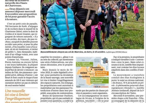 La mobilisation en Chartreuse continue de faire parler dans les médias, alors qu’une proposition de loi pour dépénaliser l’accès à la nature va prochainement être déposée.Voici un article paru dans le journal La Croix du jeudi 9 novembre 2023.Lire l’article : la-croix.com/planete/En-Chartreuse-citoyens-contre-privatisation-montagne-2023-11-08-1201289938