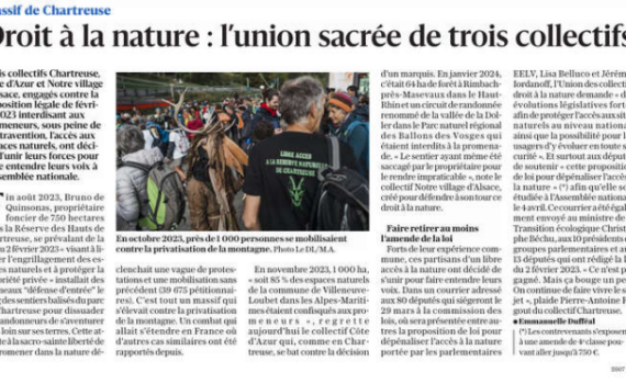 Trois collectifs Chartreuse, Côte d’Azur et Notre village d’Alsace, engagés contre la disposition légale de février 2023 interdisant aux promeneurs, sous peine de contravention, l’accès aux espaces naturels, ont décidé d’unir leurs forces pour faire entendre leurs voix à l’Assemblée nationale. Lire l’article : ledauphine.com/economie/2024/03/14/isere-massif-de-chartreuse-droit-a-la-nature-l-union-sacree-de-trois-collectifs